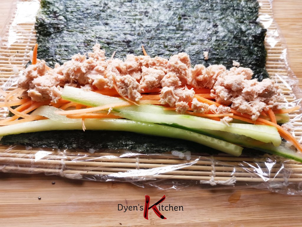 Disposer horizontalement à 1 cm du bord de la feuille de nori, un filet de mayonnaise, vos lamelles de légumes et du thon émietté.