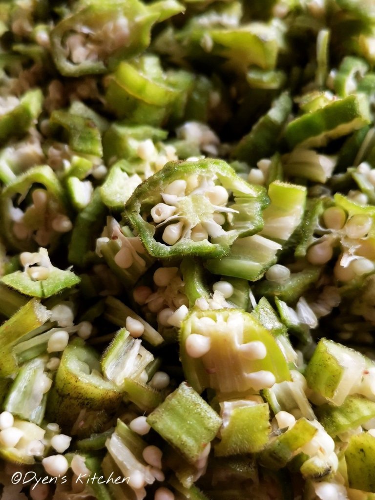 Rincez vos gombos, couper les extrémités puis hacher le tout.