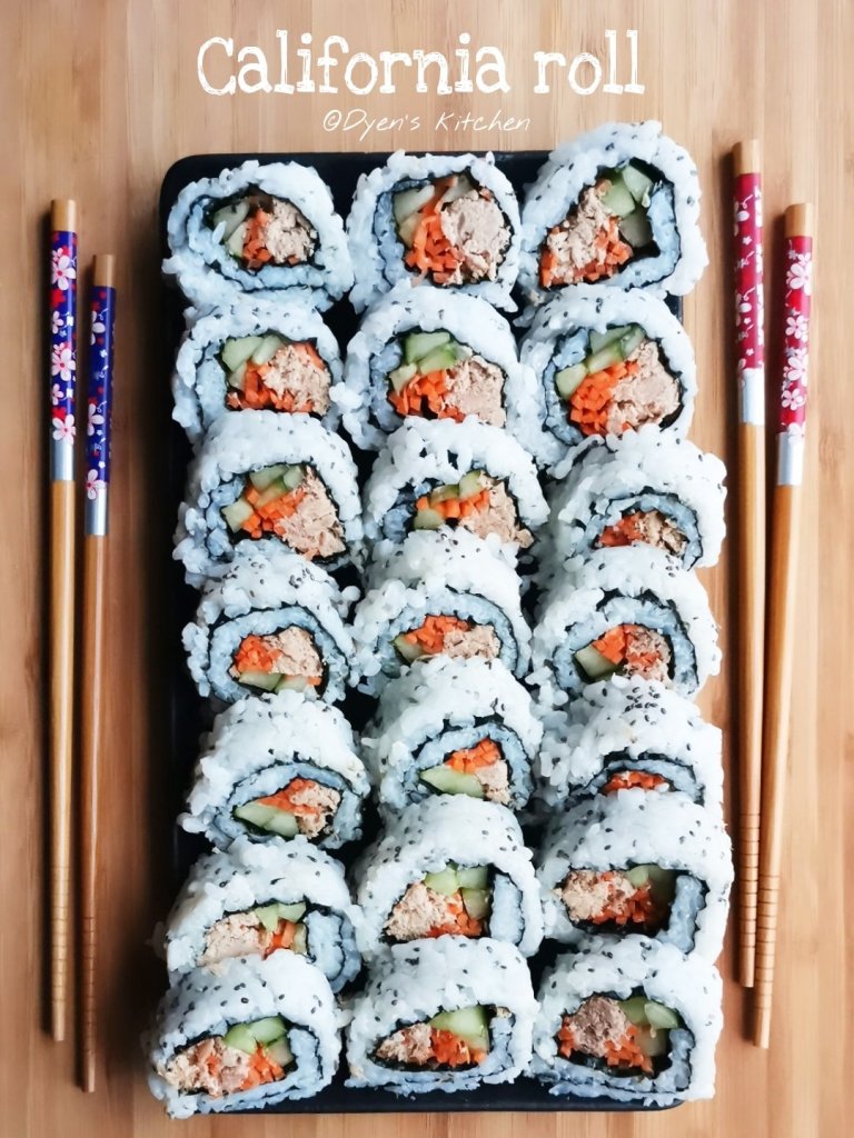 Le california roll (maki californien) ou le maki inversé est un type particulier d’uramaki. Contrairement aux maki sushi traditionnels, le riz du California roll est à l’extérieur du rouleau et la feuille de nori à l’intérieur. Au niveau des ingrédients, le california roll se compose habituellement de concombre, d’avocat, de bâtonnets de surimi et de mayonnaise etla couche de riz est recouverte de graines de sésame, d’oignons fruits, ou d’œufs de poisson…