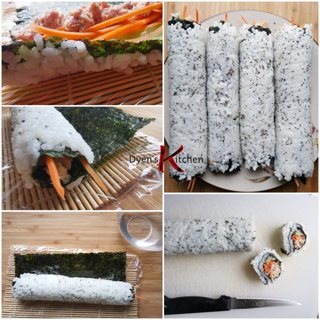 Retirez la natte en bambou et finir de rouler. N’hésitez pas à tremper vos doigts dans votre bol d’eau si le riz devient trop collant.