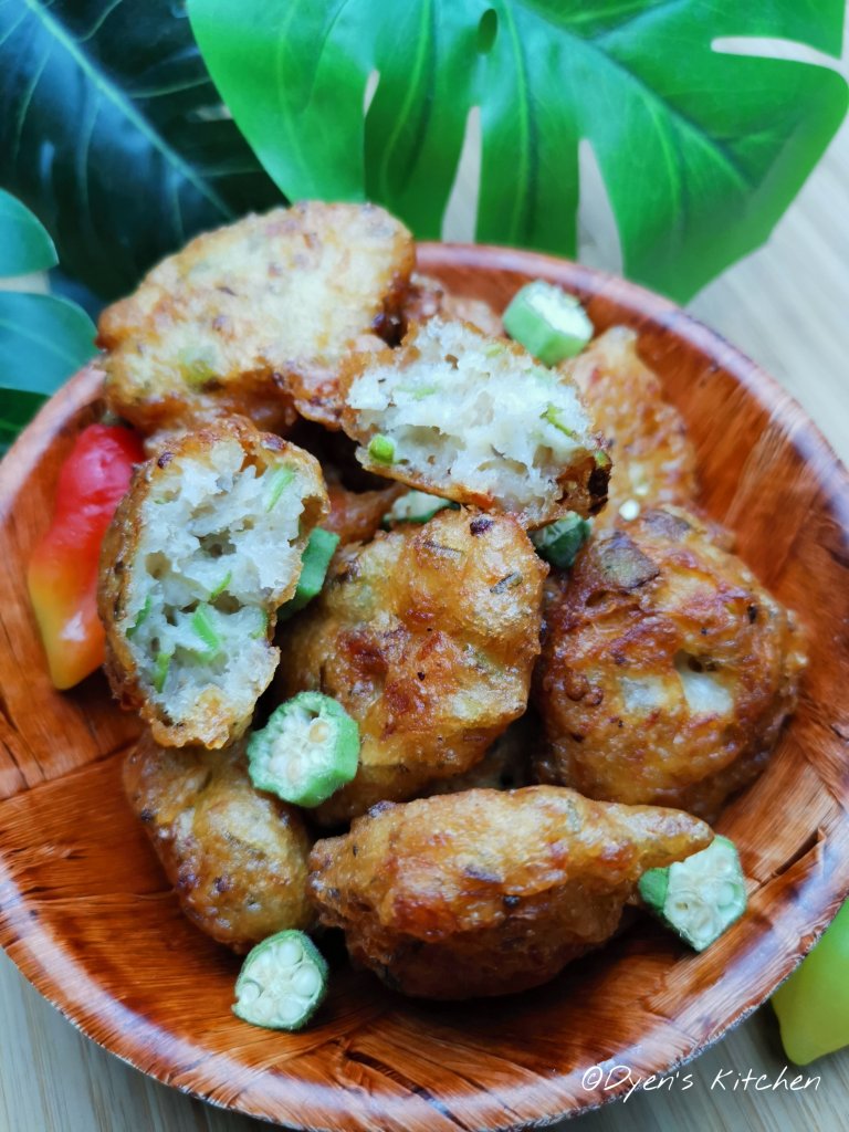 250g de gombos hachés 300g de cabillaud cuit 350g de farine 1 sachet de levure chimique 2 piments végétariens hachés 1/2 c à c de piment en poudre 1 c à c de grain de cumin 1 c à c de thym 2 c à c de sel 1 c à c d’ail semoule Une pincée de coriandre en poudre Une pincée de poivre noir 1 cube de poisson (facultatif) 350ml d’eau
