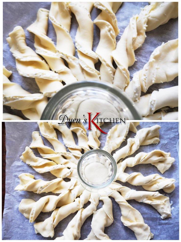 Placez un verre au centre du cercle de la pâte feuilletée. Taillez dans la pâte pour faire des bandes puis délicatement, découper vos bandes que vous allez tourner une par une.