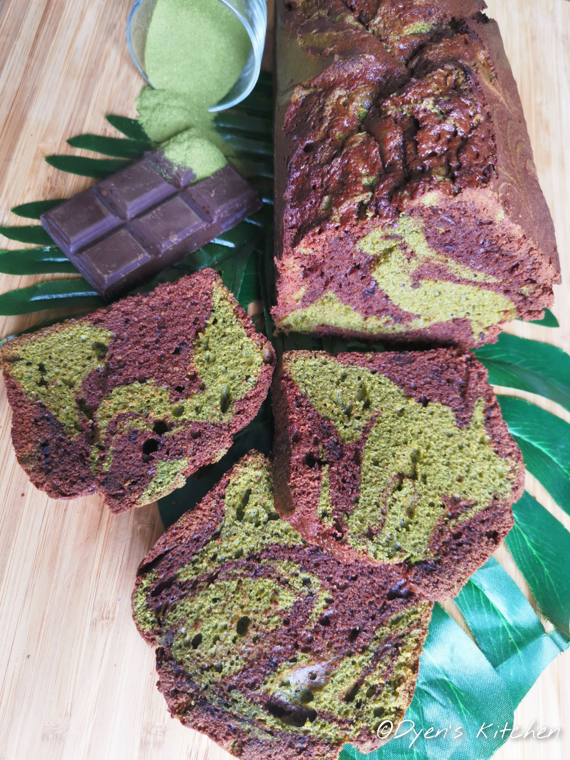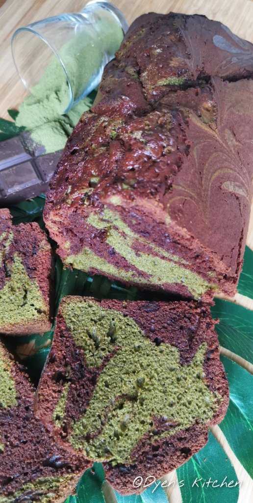 Je vous propose une version sucre avec du moringa en poudre, un cake marbré avec du chocolat.